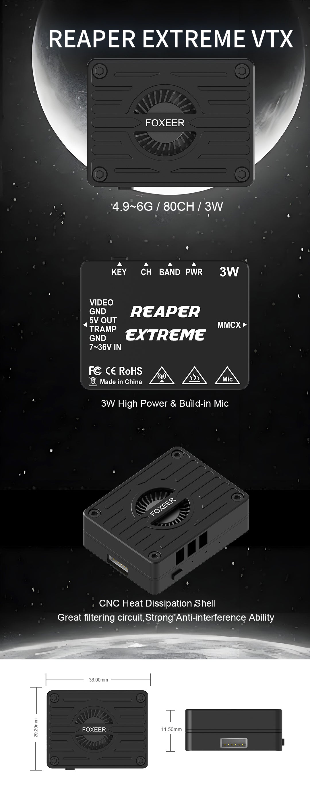 Foxeer Reaper Extreme 3W 4.9-6G - це високоякісний передавач відеосигналу високої потужності, призначений для використання в системах FPV для безпілотних літальних апаратів та дронів. Він забезпечує стабільний і високоякісний відеосигнал, що дозволяє пілотам отримувати чітке та безперебійне зображення навіть на великих відстанях. Це ідеальний вибір для пілотів дронів, які потребують надійного та потужного передавача відеосигналу для професійного використання.