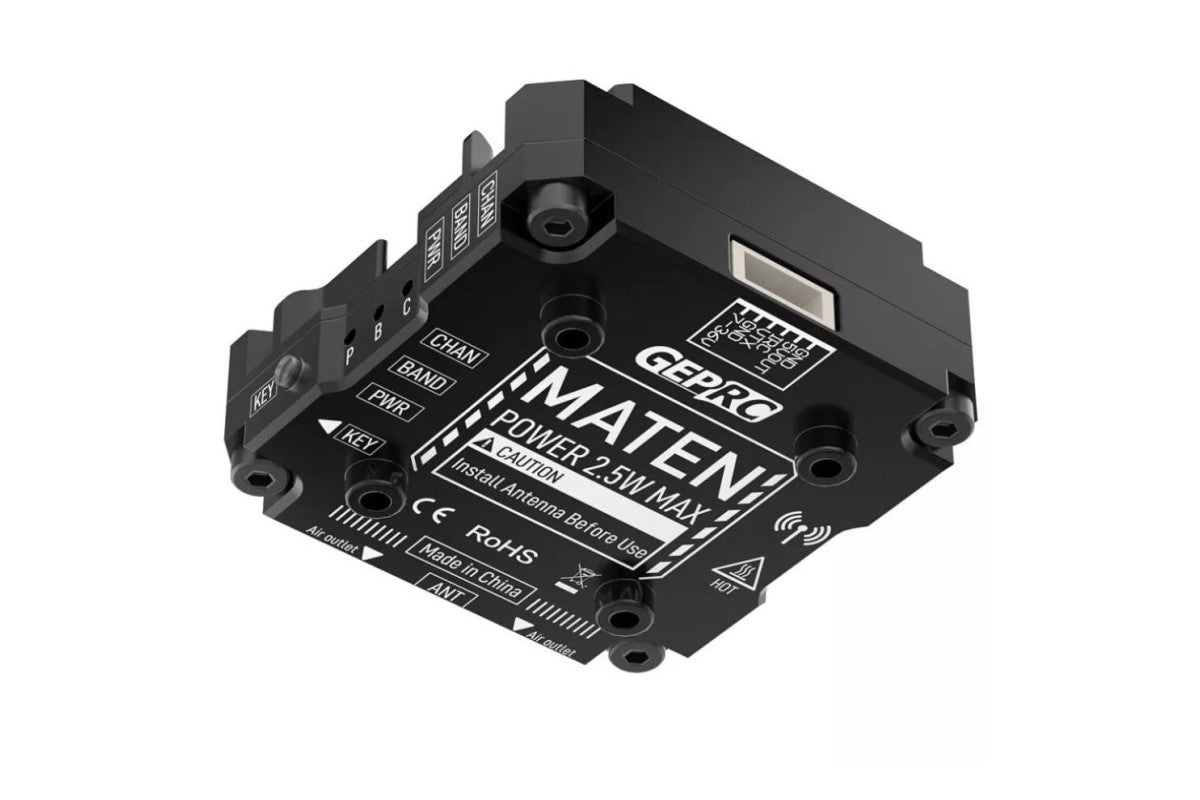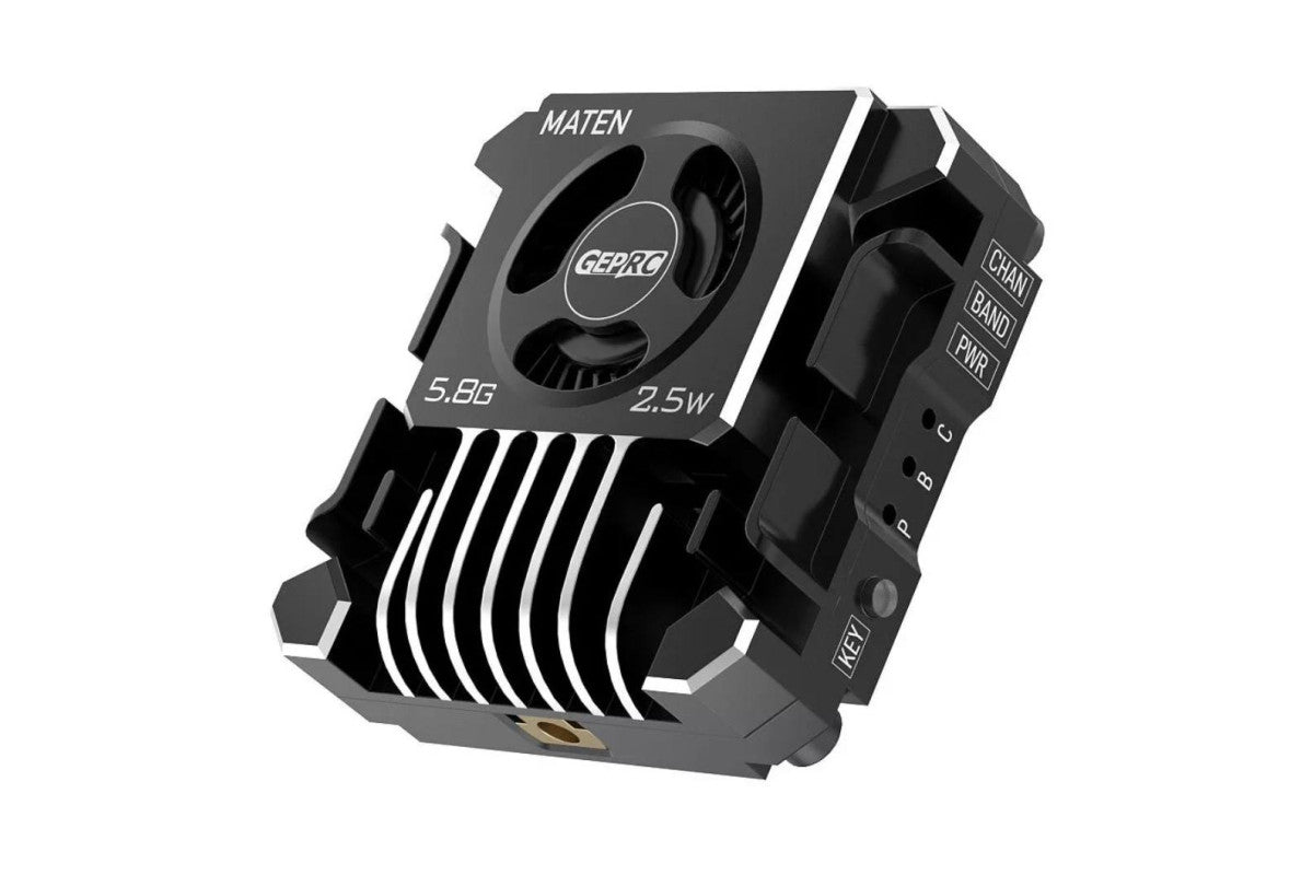 Відеопередавач GEPRC MATEN 2.5W 5.8G VTX PRO, який нещодавно вийшов на ринок від бренду GEPRC, вражає своєю бездоганною продуктивністю! Має 5 рівнів регулювання потужності та максимальними показниками до 2500 мВт , цей передавець гарантує неймовірно стабільний сигнал і бездоганну проникливість.